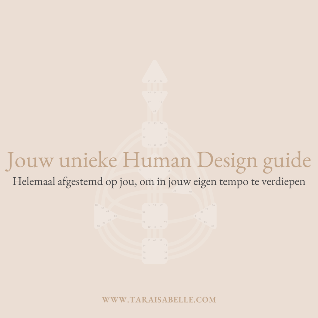 Deze persoonlijke gids is volledig afgestemd op jouw chart en gaat dieper in op alle belangrijke onderdelen van jouw design: type, strategie, autoriteit, talenten, uidagingen, profiel, centra én jouw kanalen.
